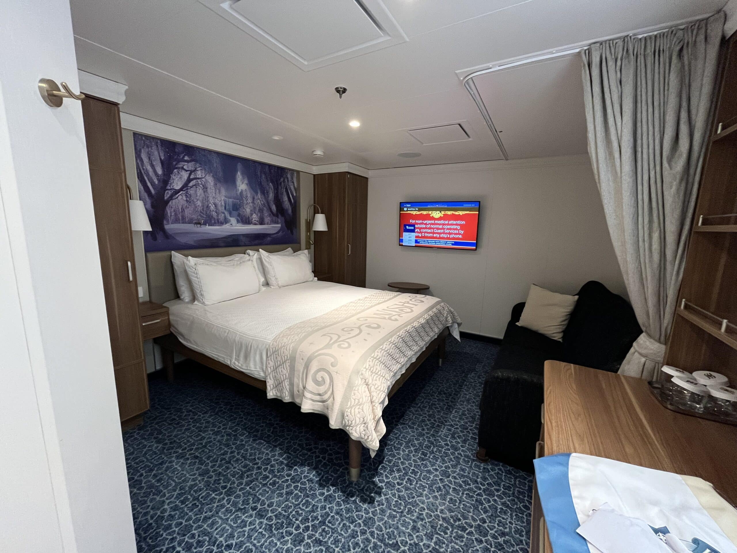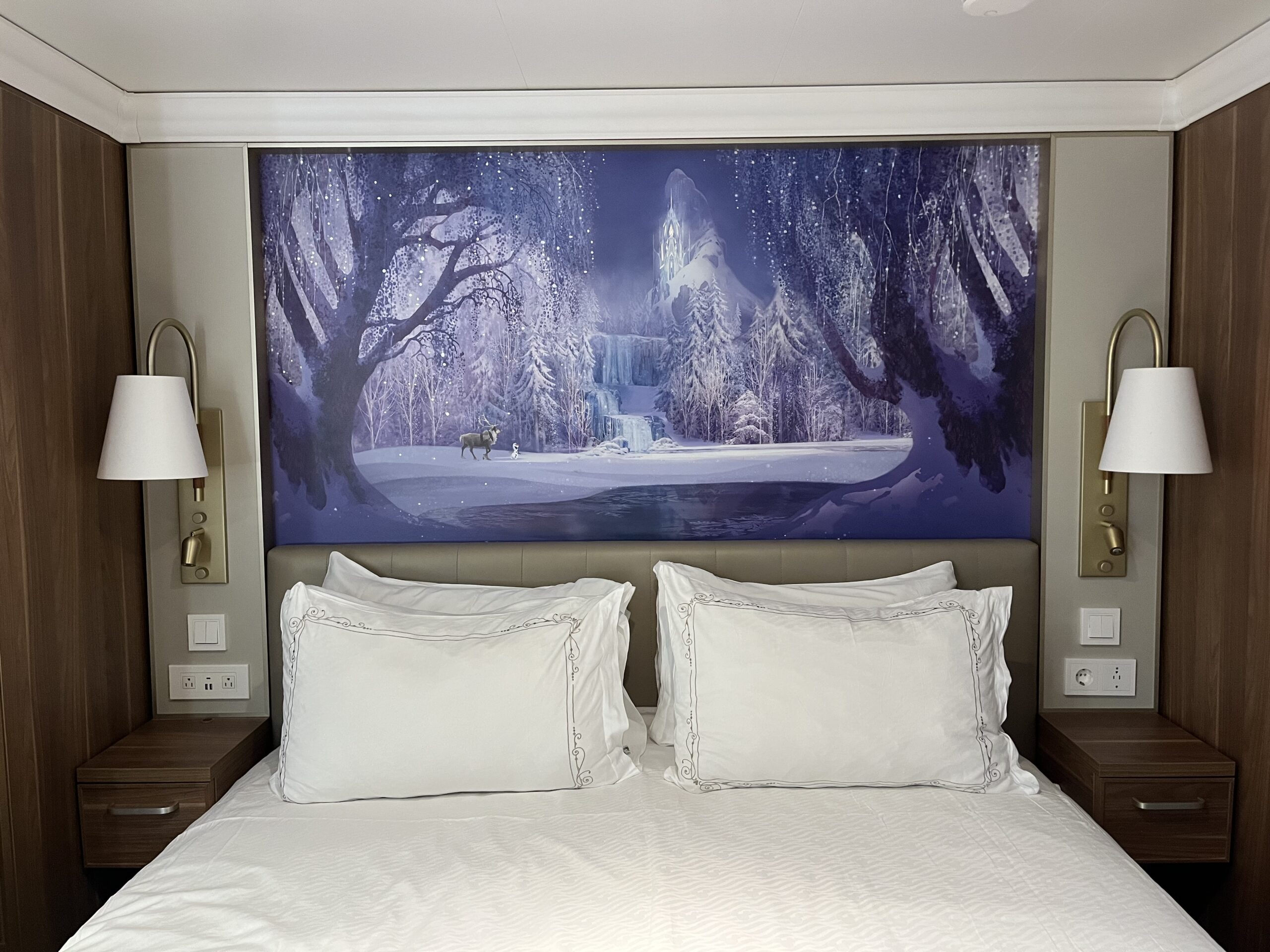 Each room on Disney Wish has a themed mural above the bed. Ours was Frozen, featuring Olaf and Sven. My son (and I) are big Frozen fans, so we were thrilled!