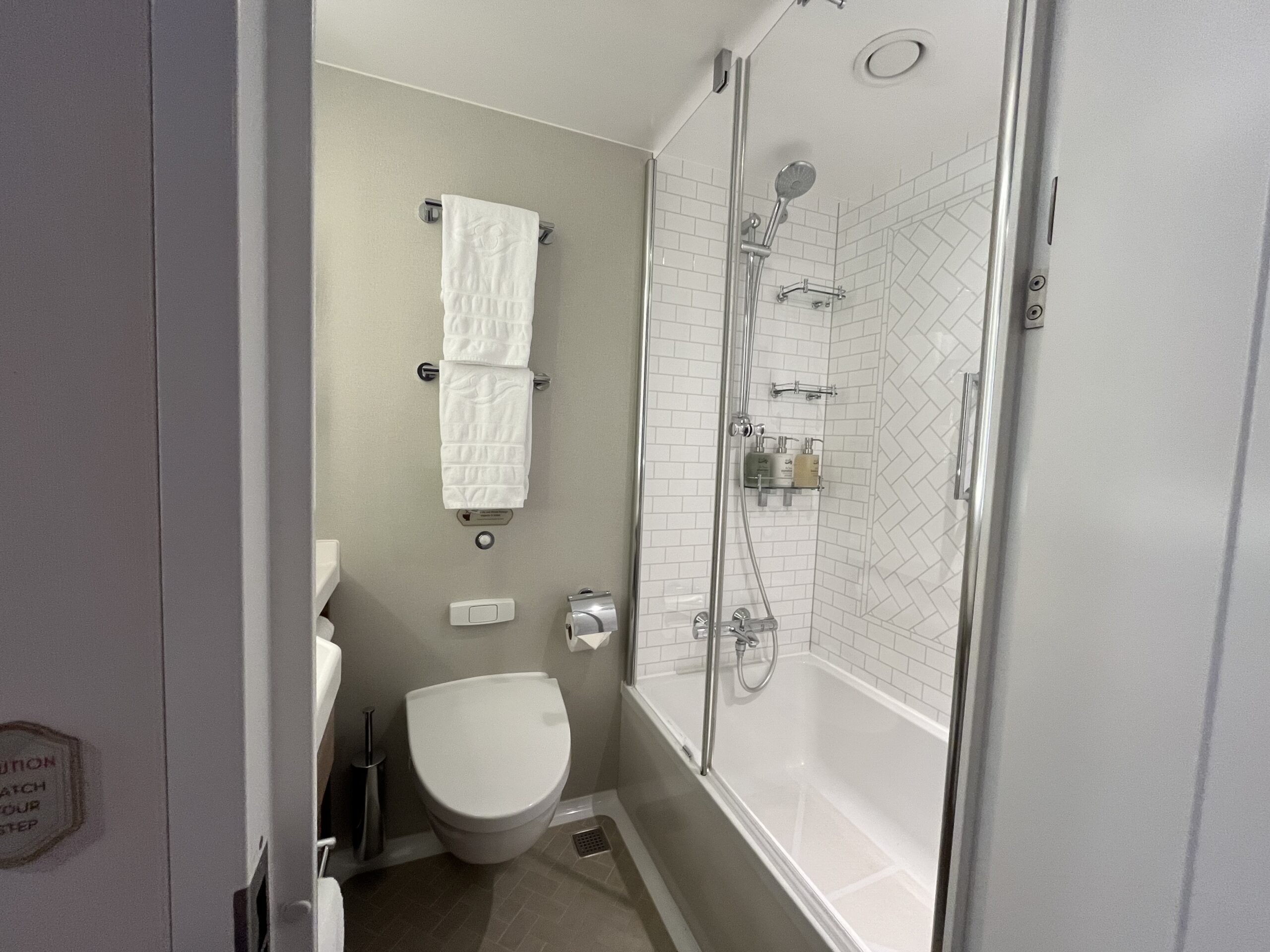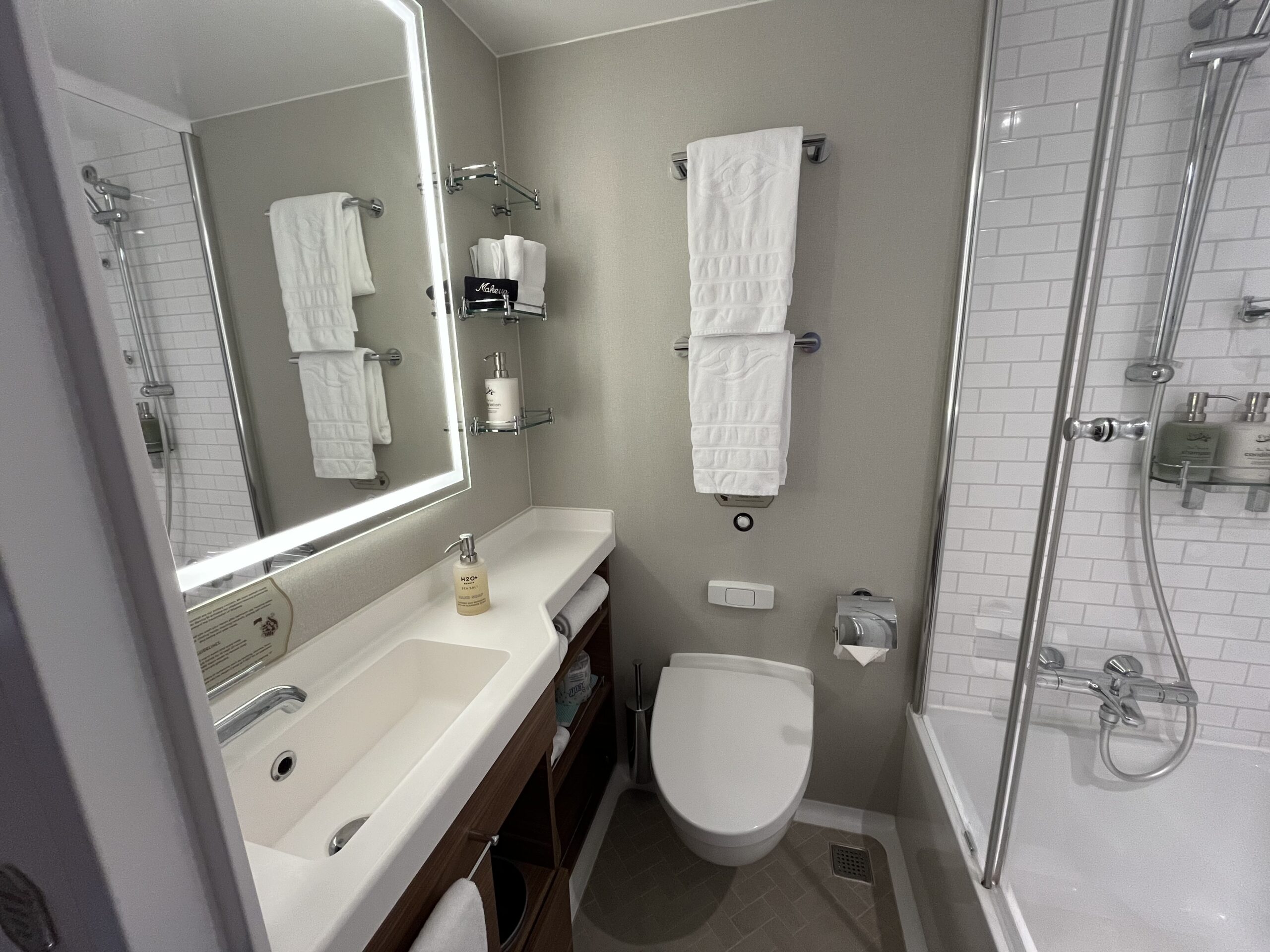 In the shower, there are two retractable clotheslines for hanging wet items. Shampoo, conditioner, and body wash are also provided. The shower head is adjustable and can be moved up and down depending on your height. Though the shower is smaller than one you’d find on land, my six-foot-tall husband had no issues with it throughout our sailing.
