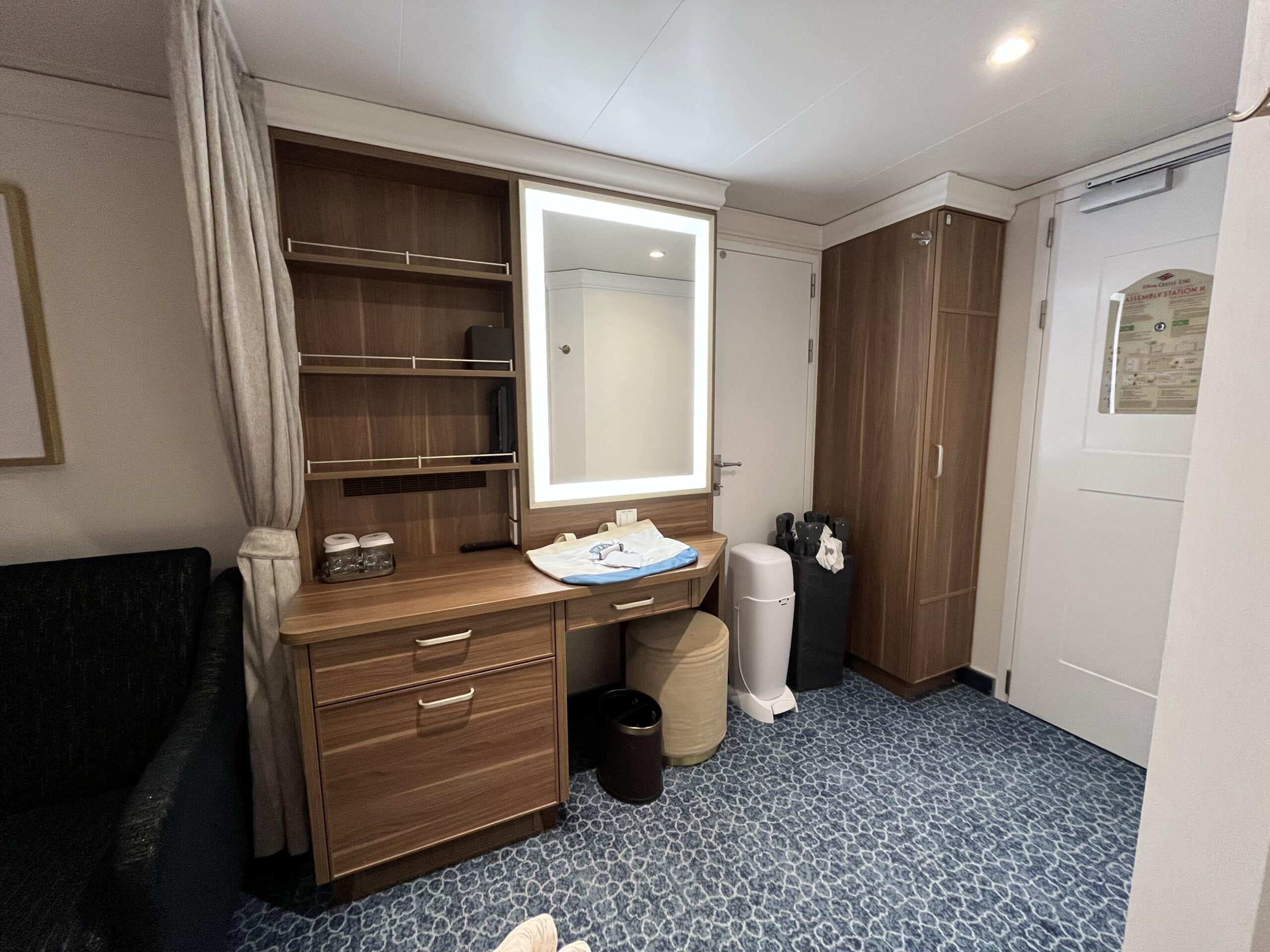 There was a small coffee table, if you want to call it that, on the side of the bed. While it was easily movable, it had no real purpose and ended up just being something we had to navigate around. Next time, I’d ask our stateroom attendant to just take it out.