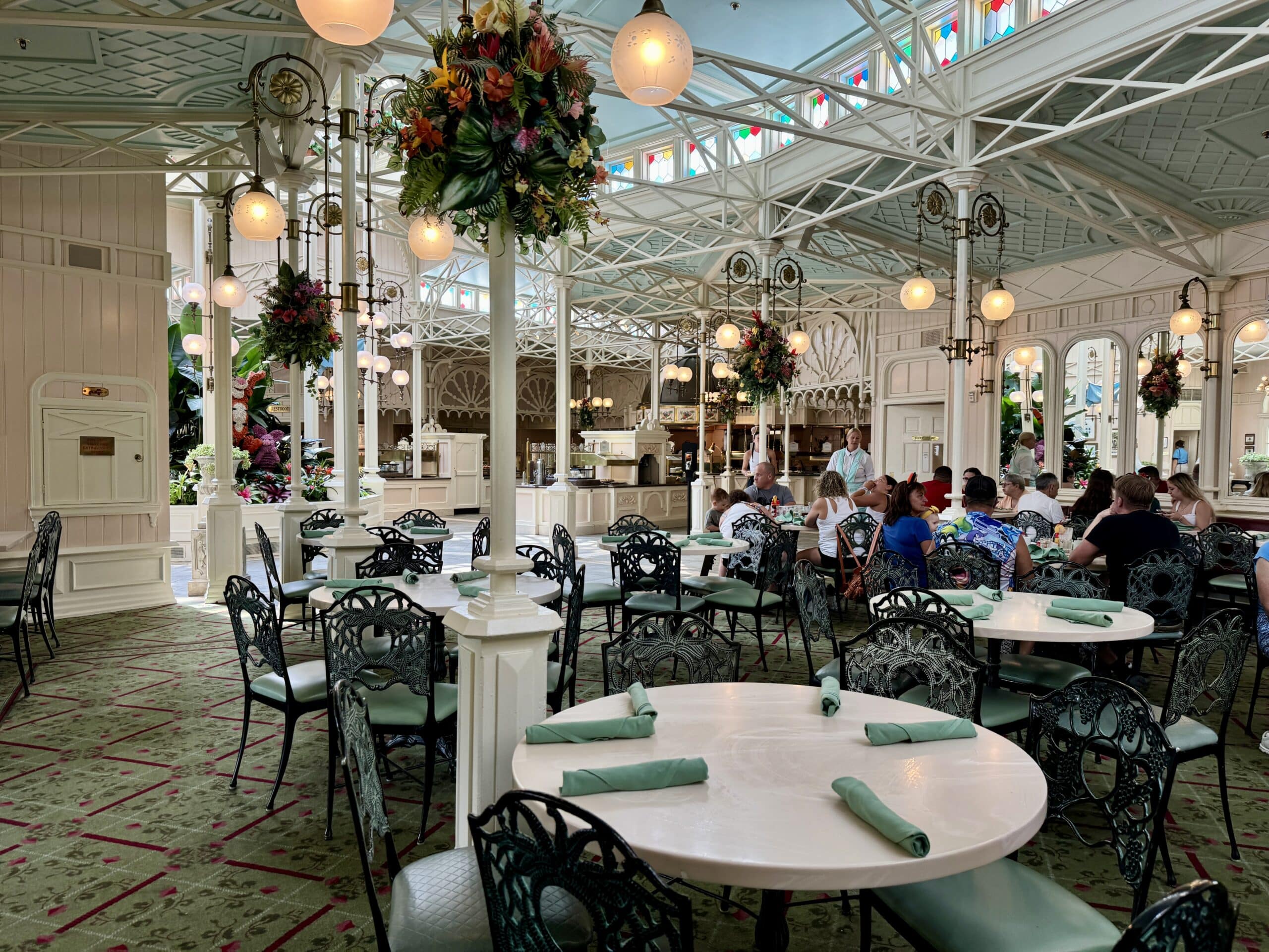 The Crystal Palace is a Victorian greenhouse-style restaurant located on Main Street, U.S.A. in Magic Kingdom. Serving breakfast, lunch, and dinner in buffet style, this bright and airy dining spot features Winnie the Pooh and friends from the Hundred Acre Wood, who visit your table for photos and autographs throughout your meal. The location here is pretty unbeatable, as the restaurant overlooks Cinderella Castle and sits right in the heart of the park.