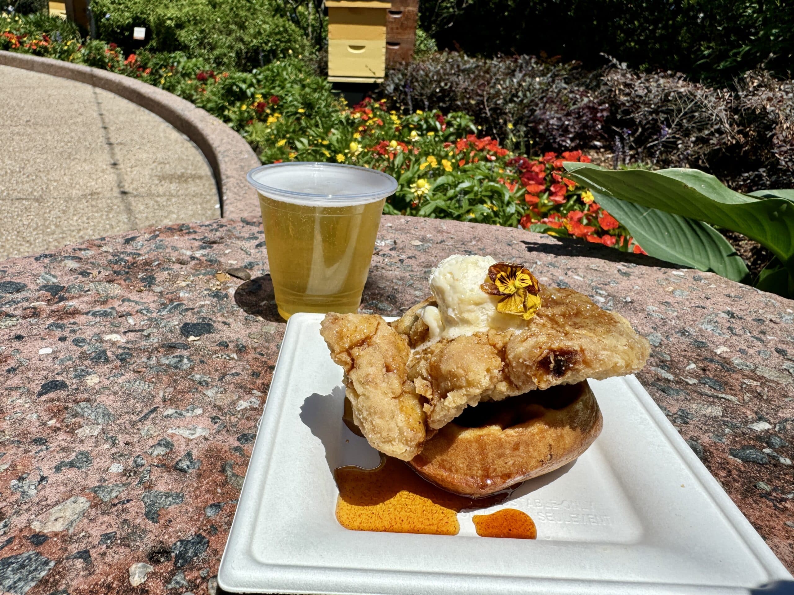 These chicken and waffles are a classic Flower and Garden staple, and this year is no different! Crispy chicken is set atop a honey-cornbread waffle with honey butter and an orange-honey glaze.