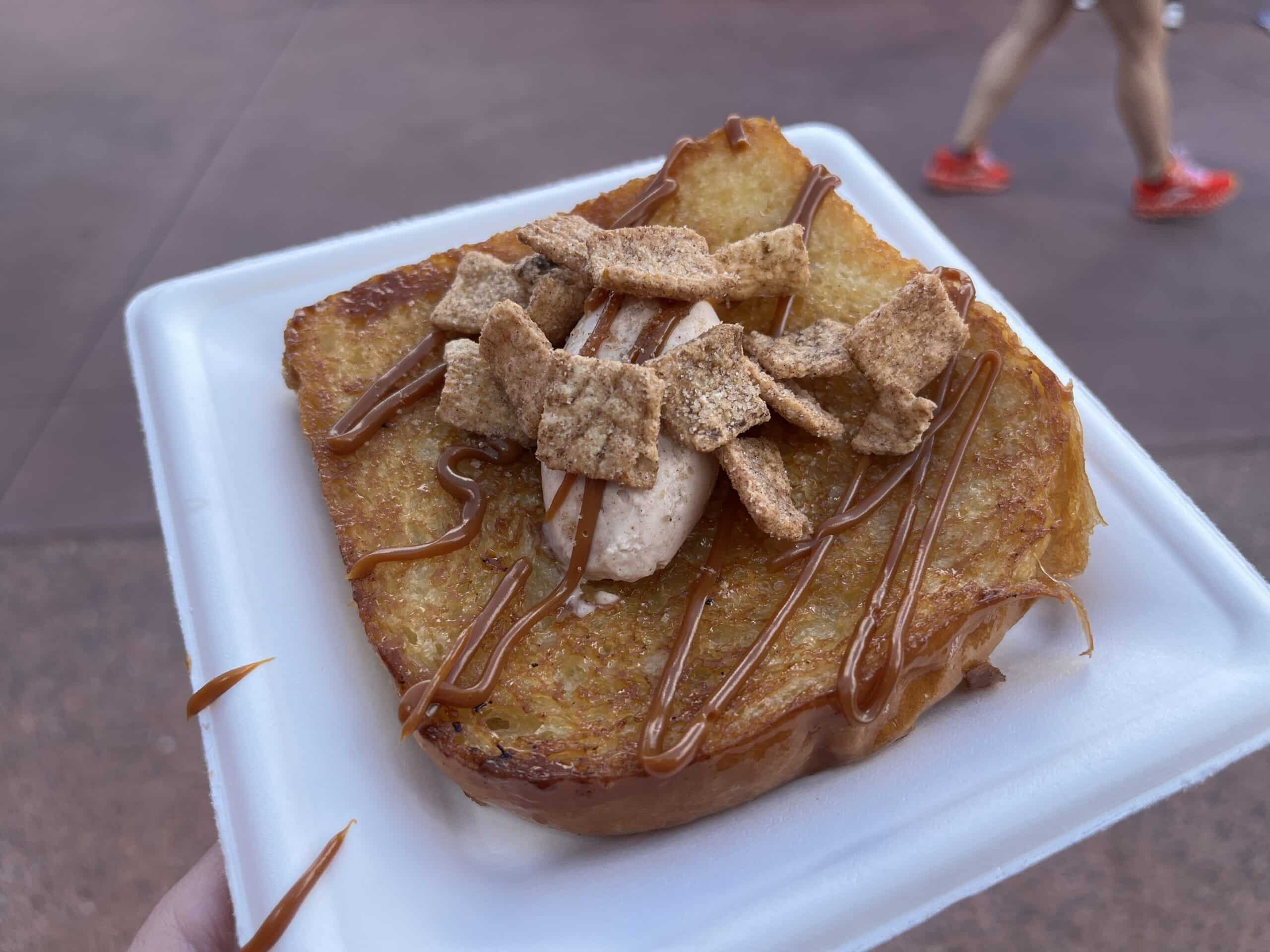 This sandwich bread French toast was topped with a cinnamon cereal cream, caramel sauce, and Cinnamon Toast Crunch. This was SO sweet. It tasted good, overall. Though, I could have done without the cream.Β