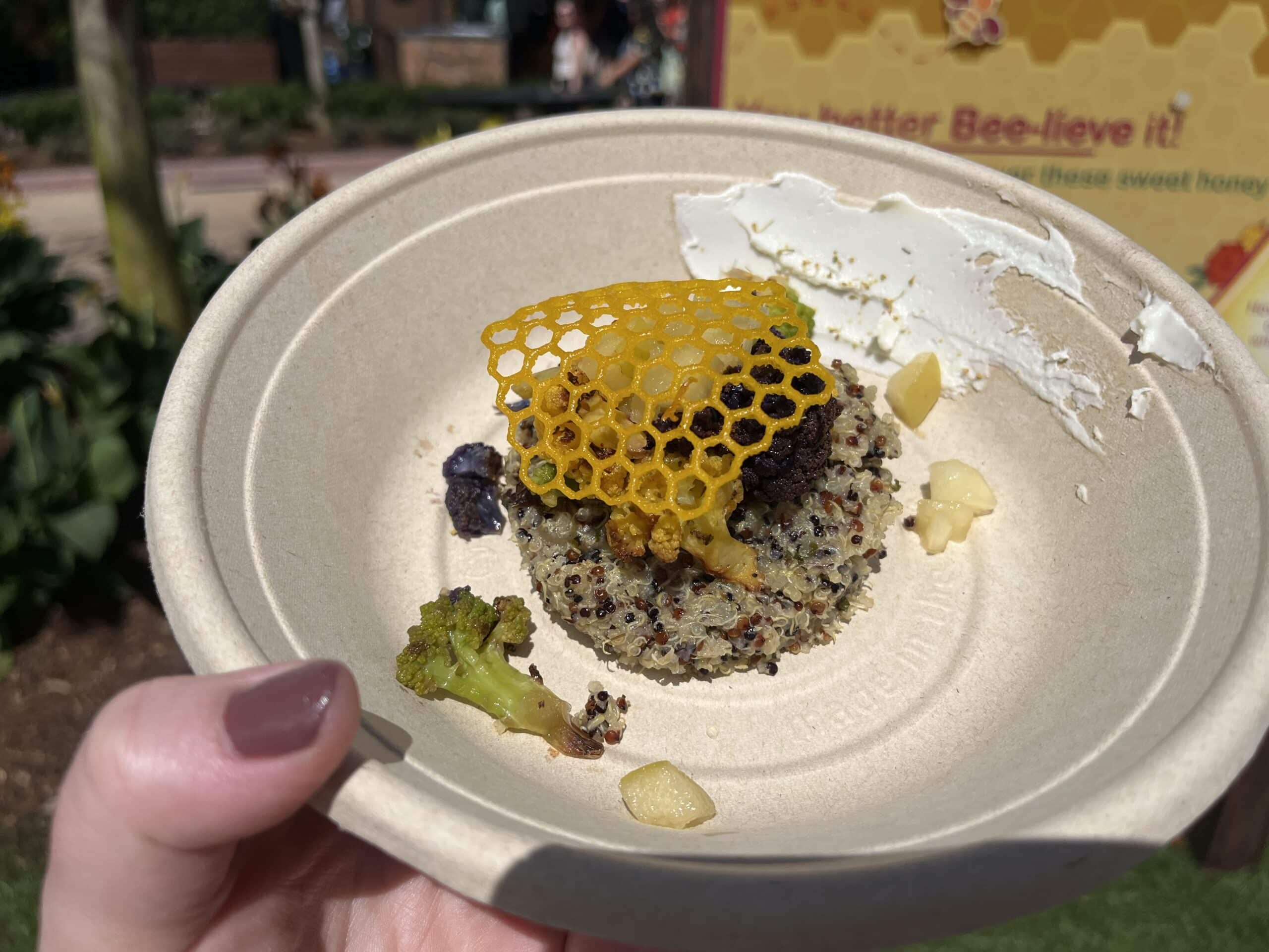 Vegetarians sometimes get the short end of the stick at EPCOT festivals, but not this year! This new addition to a popular booth contains herbed quinoa, honey goat cheese, apples, and cauliflower, all topped with a piece of honeycomb.Β
