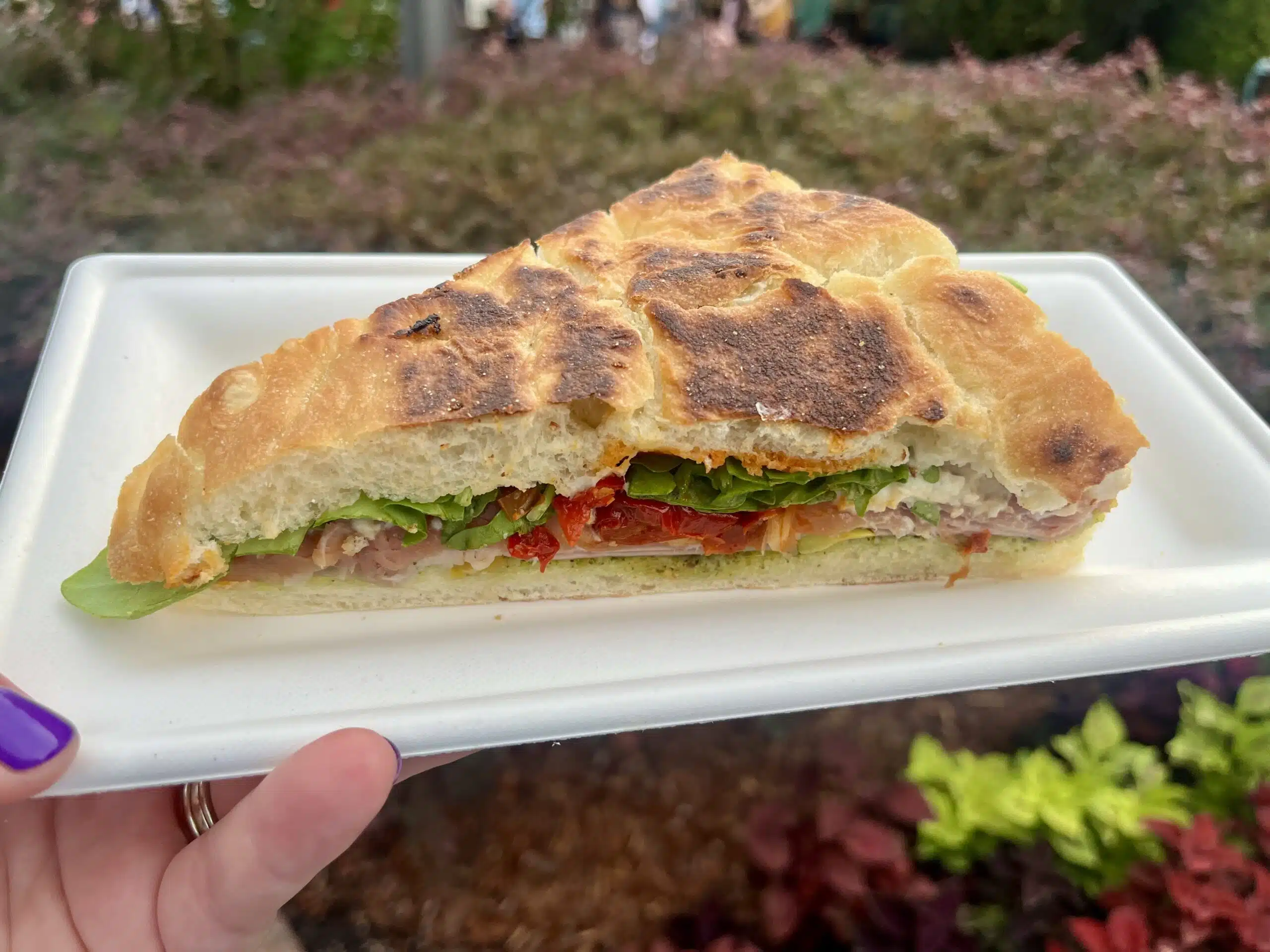 Sticking with the fall-themed Forest and Field marketplace, the Schiacciata Sandwich is a must. The warm focaccia sandwich is filled with mortadella, prosciutto, sun-dried peppers, arugula, cheese, fall squash mostarda, and a pistachio pesto.