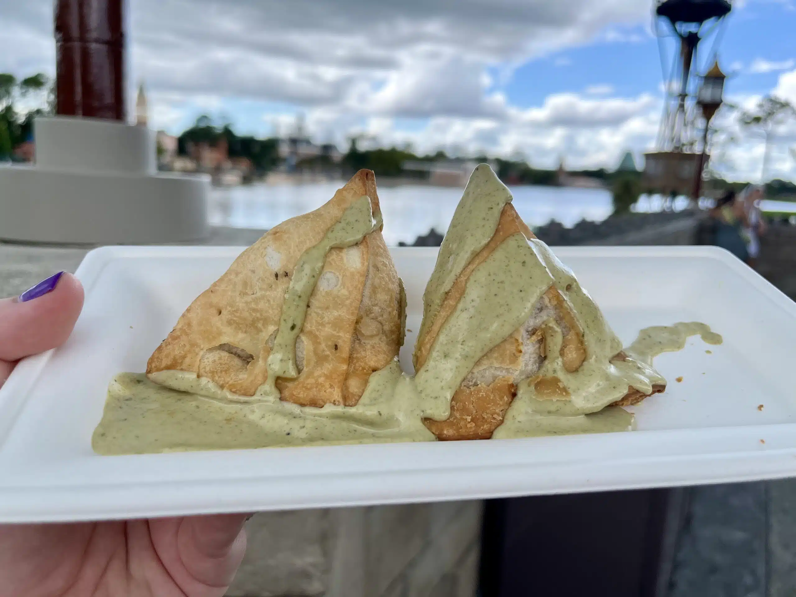 The Pea and Potato Samosas check so many boxes year after year, hence why they keep returning! It’s a simple dish, yet packed with flavor. For one, they are vegan, and there aren’t many vegan options throughout this year’s festival. Secondly, they are spicy—in a good way! It can be hard to find something with legitimate spice anywhere in Disney World. However, the coriander-lime cream that tops the samosa does a good job of balancing the heat.