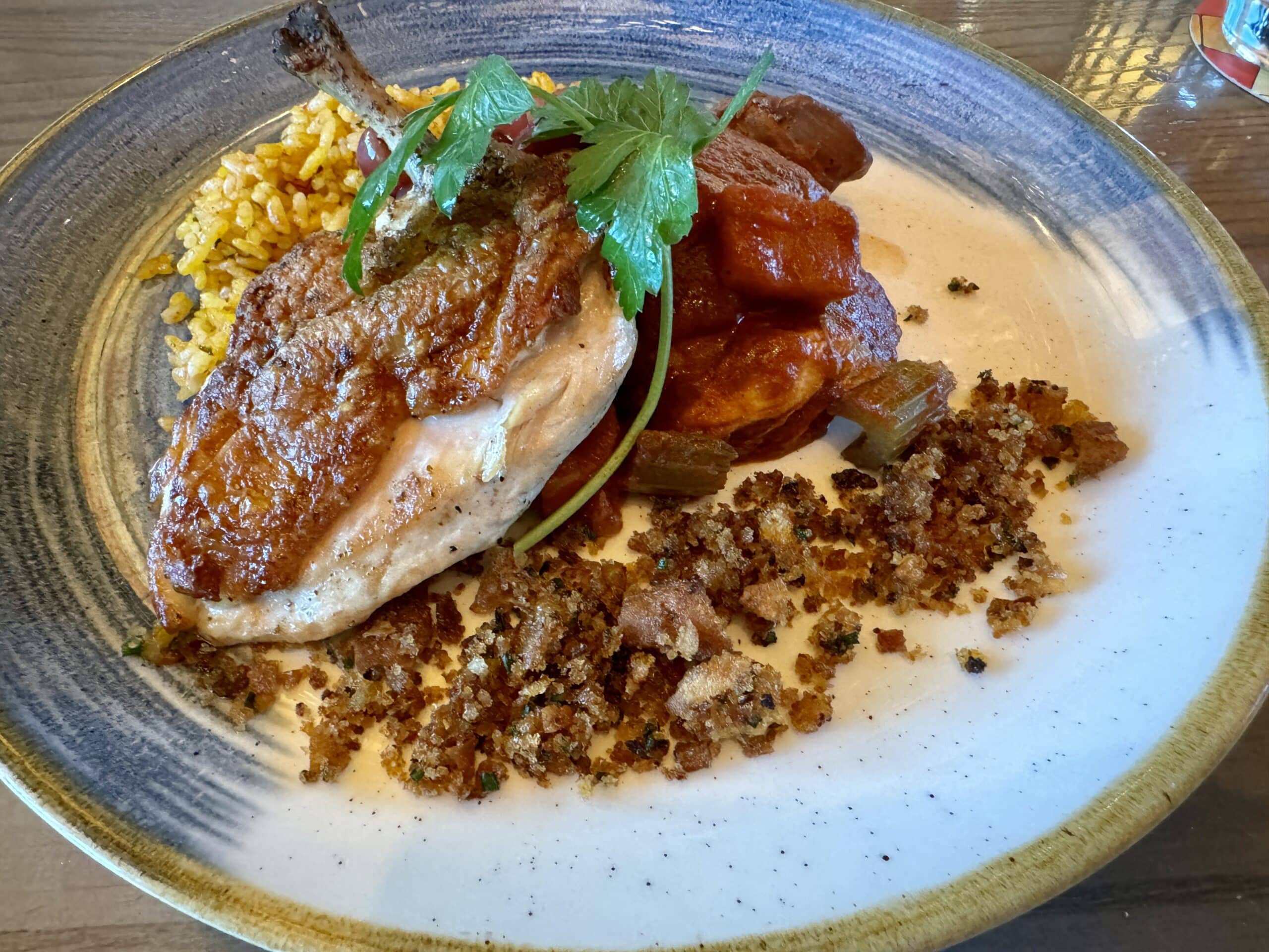 The dinner menu takes inspiration from the coastal Mediterranean, reflecting both French and Italian influences, just like the resort. The wine list is extensive, and the food menu is modern with an upscale twist. We’ve dined here many times, and some of our favorites are the Filet Mignon and the Chicken Sugo Rigatoni.