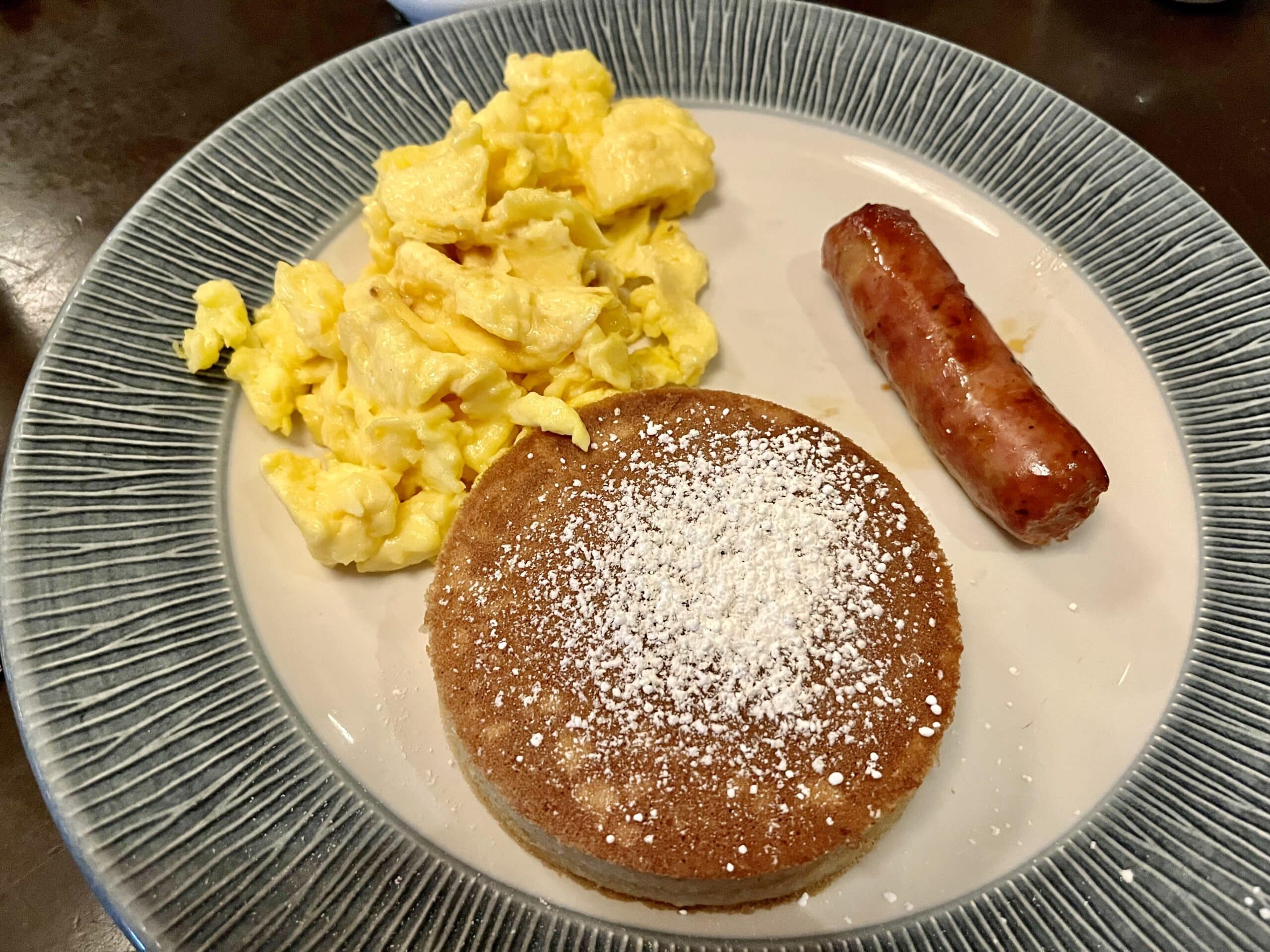 Starting with the kids’ meal, my son ordered the buttermilk pancake with a scrambled egg and sausage for $9.25. Just by looking at it, you could tell this was not your standard, flat, quick-serve pancake. This was a freshly made, thick, and fluffy pancake, and it tasted just as good as it looked! I’m a firm believer that kids’ meals are one of the best values across Walt Disney World, and this was no different.